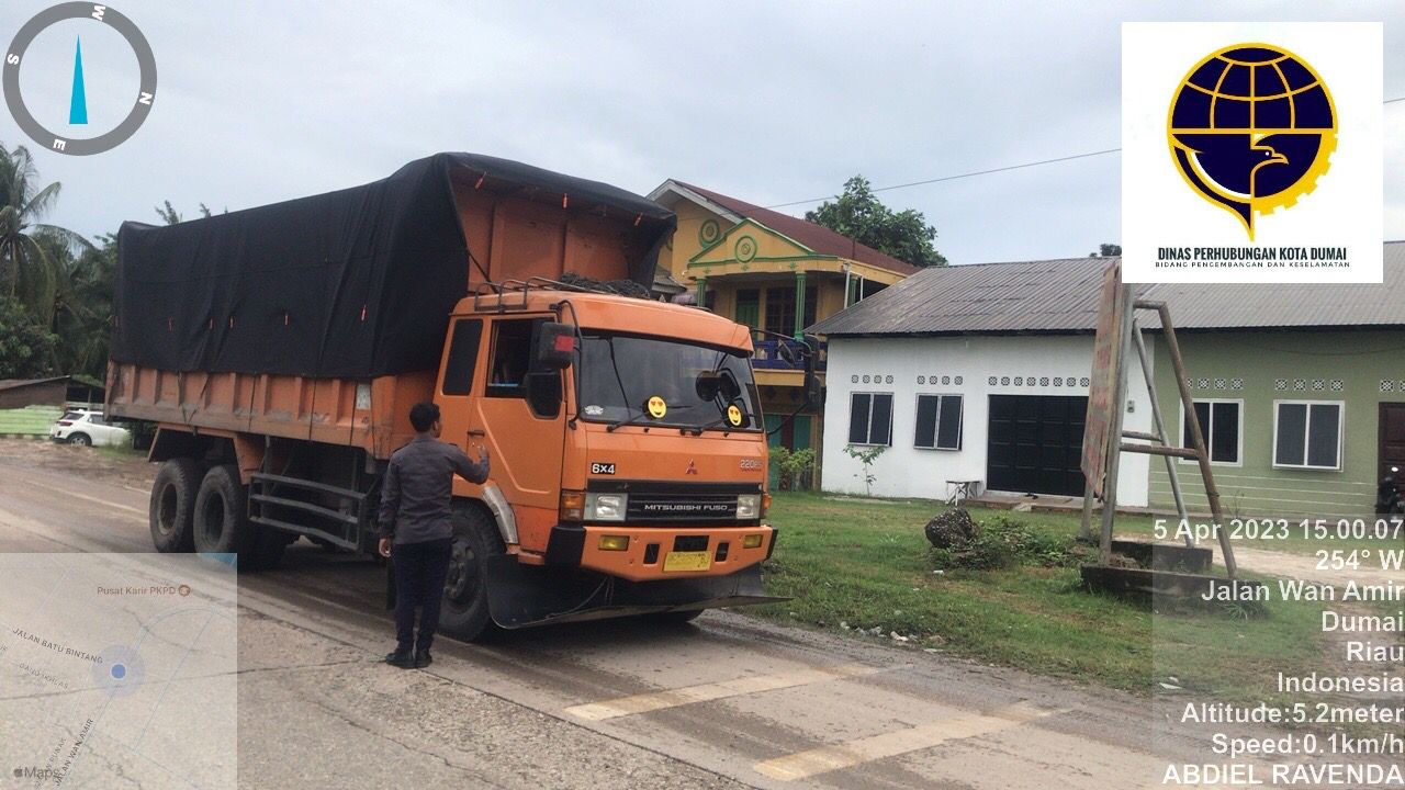 Tampak petugas Dinas Perhubungan Kota Dumai sedang memberikan peringatan kepada salah satu mobil angkutan barang