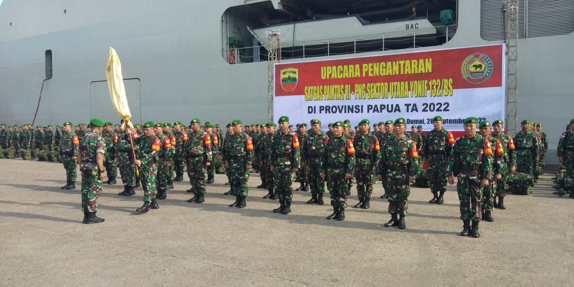 TeleskopNews.com – Upacara pelepasan Satgas Pamtas RI-PNG sektor Utara Yonif 132/BS Di provinsi Papua TA 2022 dilaksanakan di Pelabuhan Dermaga C PT Pelindo, Jalan. Datuk Laksamana Kota Dumai.