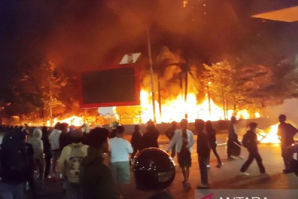 MAKASSAR –Aksi pembakaran Kantor DPRD Makassar, Sulawesi Selatan terjadi saat massa melakukan aksi solidaritas atas kematian ojol Affan Kurniawan, Jumat (29/8).