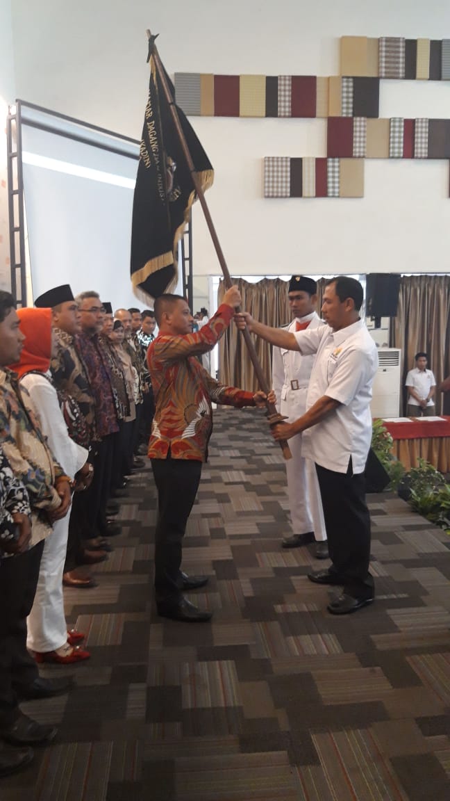 | Ketua Kadin Provinsi Riau, Juni Ardianto Rachman menyerahkan bendera petakan kepada Ketua Kadin Dumai terpilih, Zulfan Ismaini di sela pelantikan kepengurusan periode 2018-2023 |